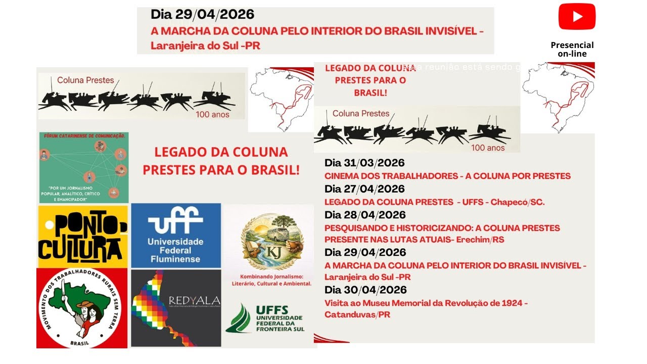 LEGADO DA COLUNA PRESTES NO BRASIL - 29/04/2026 19:30 Presencial Laranjeirasdo Sul e on-line