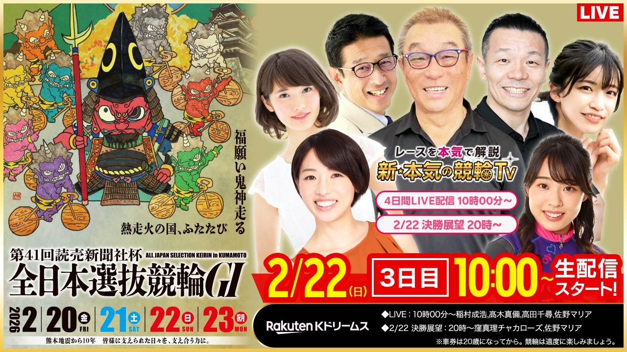 【LIVE】2026.2.22(3日目)#熊本競輪GⅠ 第41回 #読売新聞社杯全日本選抜競輪 (中野浩一/金川光浩/稲村成浩/高木真備/高田千尋/佐野マリア)#熊本競輪 #ライブ #live
