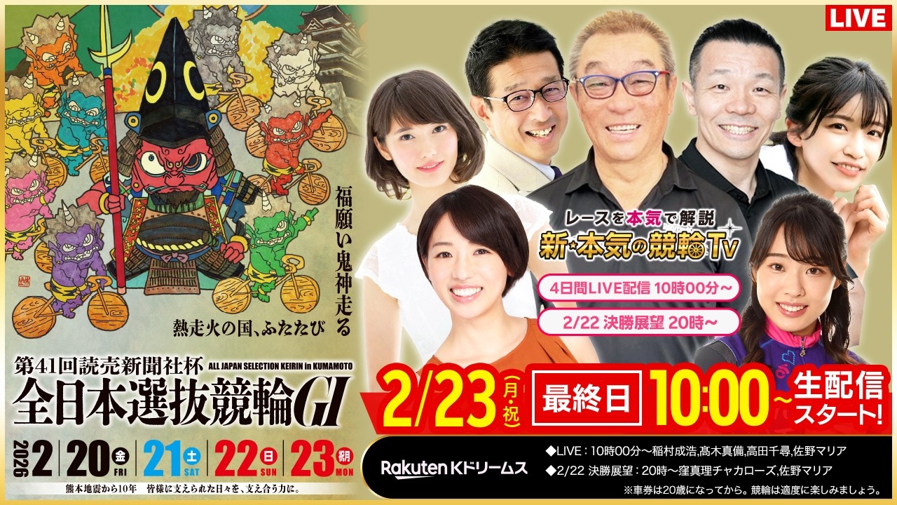 【LIVE】2026.2.23(最終日)#熊本競輪GⅠ 第41回 #読売新聞社杯全日本選抜競輪 (中野浩一/金川光浩/稲村成浩/高木真備/高田千尋/佐野マリア)#熊本競輪 #ライブ #live